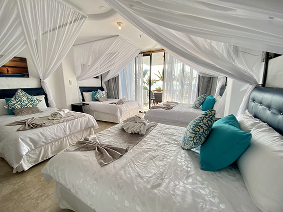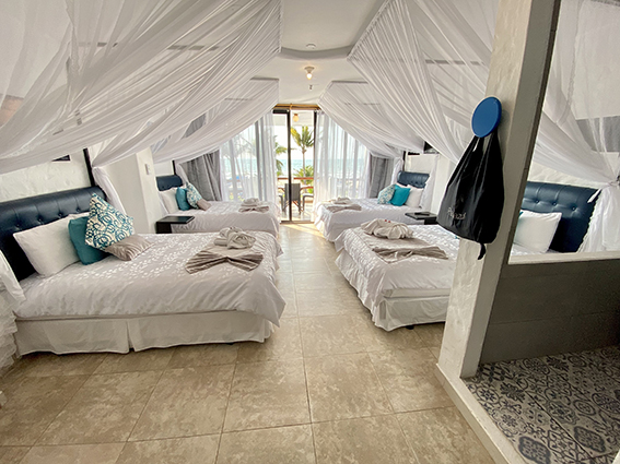 Cozy room with four full size beds that guarantee a fresh and refreshing rest, marvelous view of the sea on its large private balcony. Shower type shower that complements your stay. The biodegradable amenities of "Oilosophy" not only add luxury to your experience but also help to conserve the planet. Indulge in a breakfast that includes typical dishes, served with fresh fruit, natural juices, homemade bread and jam, plus unlimited coffee or tea.
